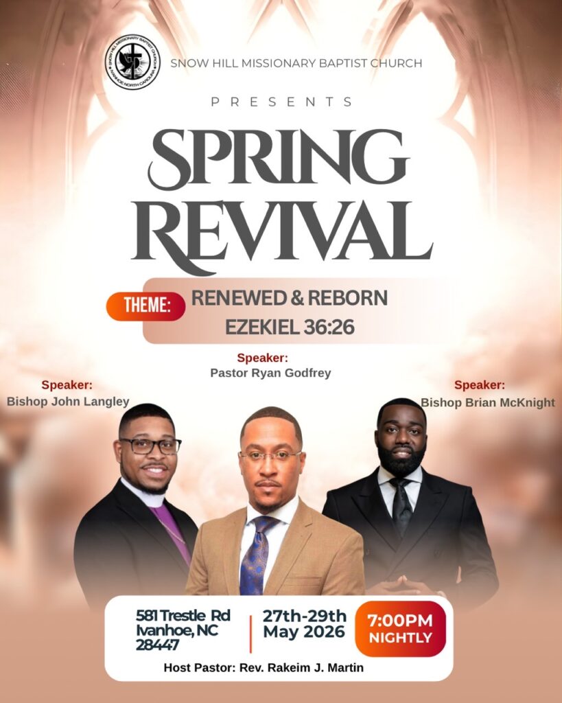 On behalf of Snow Hill Missionary Baptist Church, we are elated that you have chosen to visit our website! We welcome you and pray that the Word of God delivered from this ministry becomes a testimony and evidence that you can share with everyone that you meet.